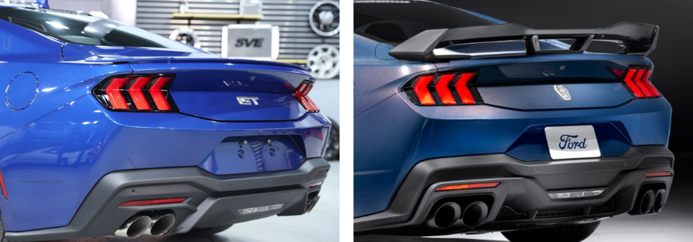 Beim GT hat man die Wahl zwischen 12 unterschiedlichen Farben inklusive des knalligen Yellow Splash Metallic. Den Dark Horse gibt es hingegen lediglich in 9 Farben, dafür kann man z.B. nur bei ihm das elegante Blue Ember Metallic wählen. Der Dark Horse verfügt allerdings über tiefere Seitenschweller, einen festen Heckflügel, einen vom Rennsport inspirierten Diffusor, eine Abgasanlage mit schwarzen Auspuff Vierfach-Endrohren, abgedunkelten LED Scheinwerfern, einen markant glänzenden schwarzen Kühlergrill sowie lackierten Lüftungsschlitzen in der Motorhaube. Kurz zusammen gefasst kann man sagen, er wirkt einfach wesentlich böser und aggressiver als der GT, der mit einem deutlich unauffälligeren Body Kit inklusive silbernen Auspuff-Vierfach-Endrohren ausgestattet ist. Beide Modelle stehen übrigens serienmäßig auf 19 Zoll Räder, allerdings in unterschiedlichen Designs.