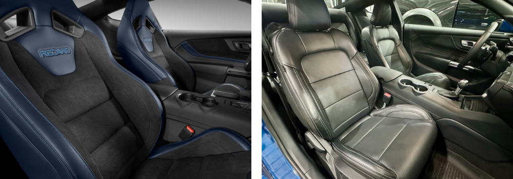 Beide Fahrzeuge kommen serienmäßig u.a. mit Sportsitzen vorne inklusive Teilleder Premiumpolster, dem Ford Navigationssystem inkl. Ford SYNC 4 mit AppLink und Touchscreen, der Ford Power-Startfunktion (schlüsselfreies Starten), dem Ford KeyFree System und dem B&O Sound System mit 12 Lautsprechern. Als kleine Zugabe hat der Dark Horse das unten abgeflachte Lenkrad in feines Wildleder gehüllt und es gibt Kontrastnähte in Indigo Blue. Die schicken Recaro Sitze kosten leider in beiden Fällen Aufpreis.