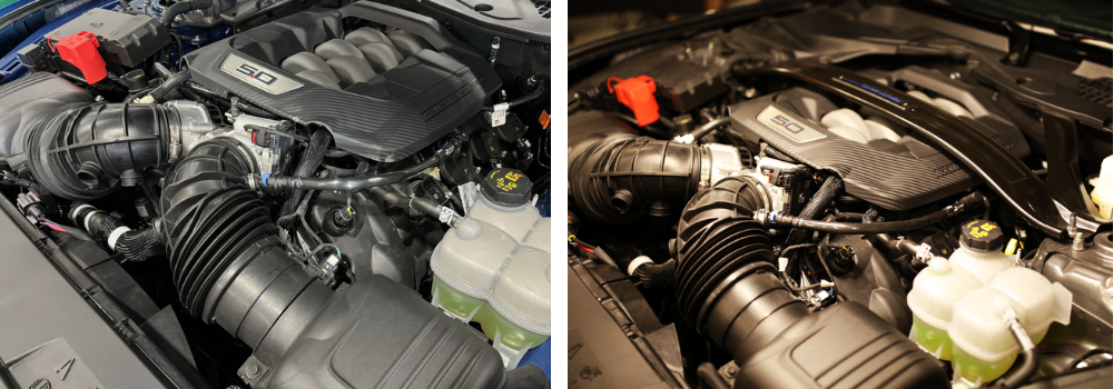 Starten wir mit dem zentralen Thema, der puren Kraft der Fahrzeuge. Beide verfügen wie erwähnt über den 5.0 Liter V8. Im GT liefert er 446 PS und 540 Nm. Das gilt für die 10 Gang Automatik ebenso wie für den Handschalter. Die Automatik verhilft dem Wagen allerdings laut Ford zu einer 0-100 km/h Beschleunigung von 5 Sekunden, während der Handschalter 0,4 Sekunden länger benötigt.